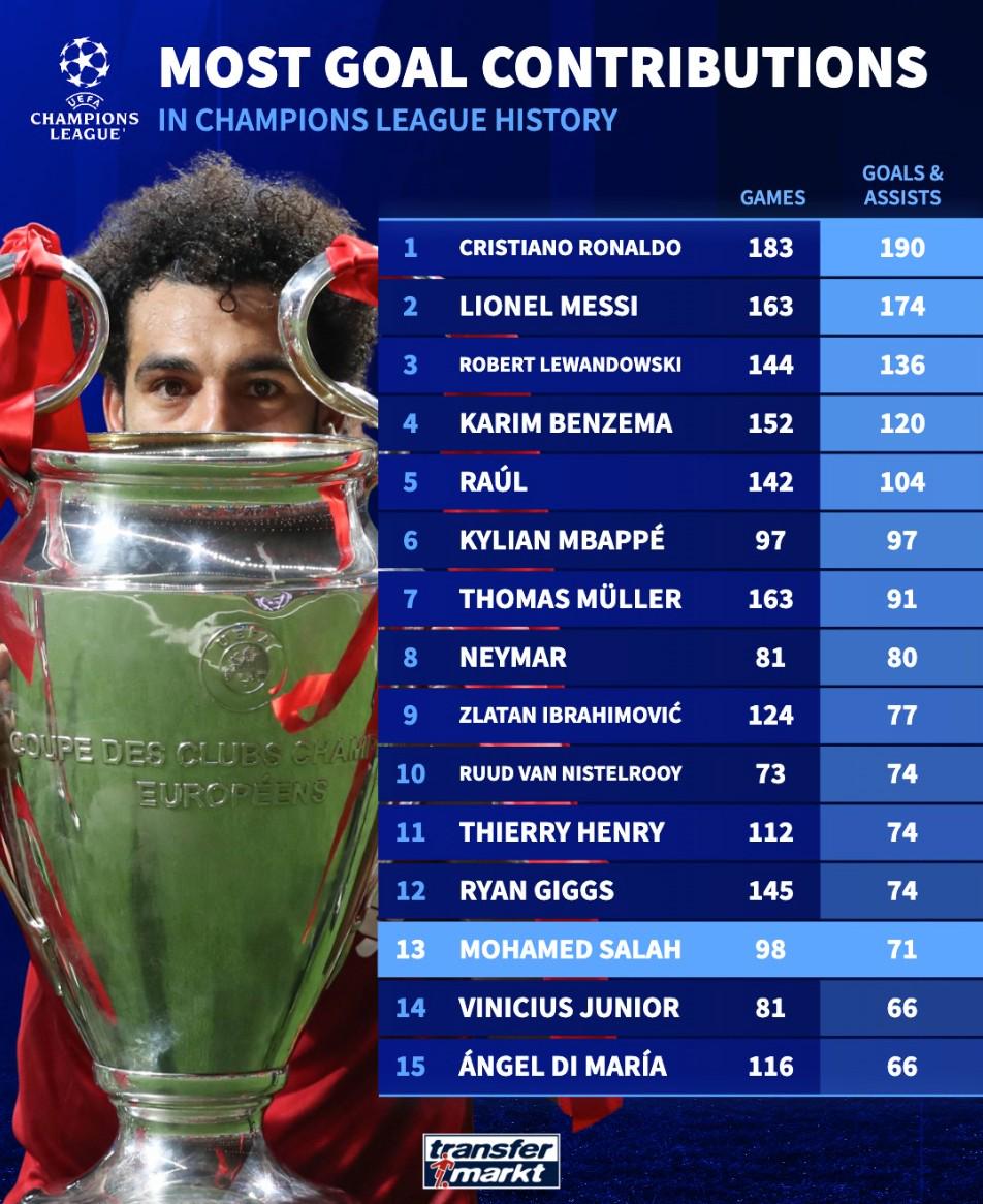 赛后德转统计出了欧冠历史直接参与进球数的排行榜,萨拉赫以98场直接参与71球排名第13位。